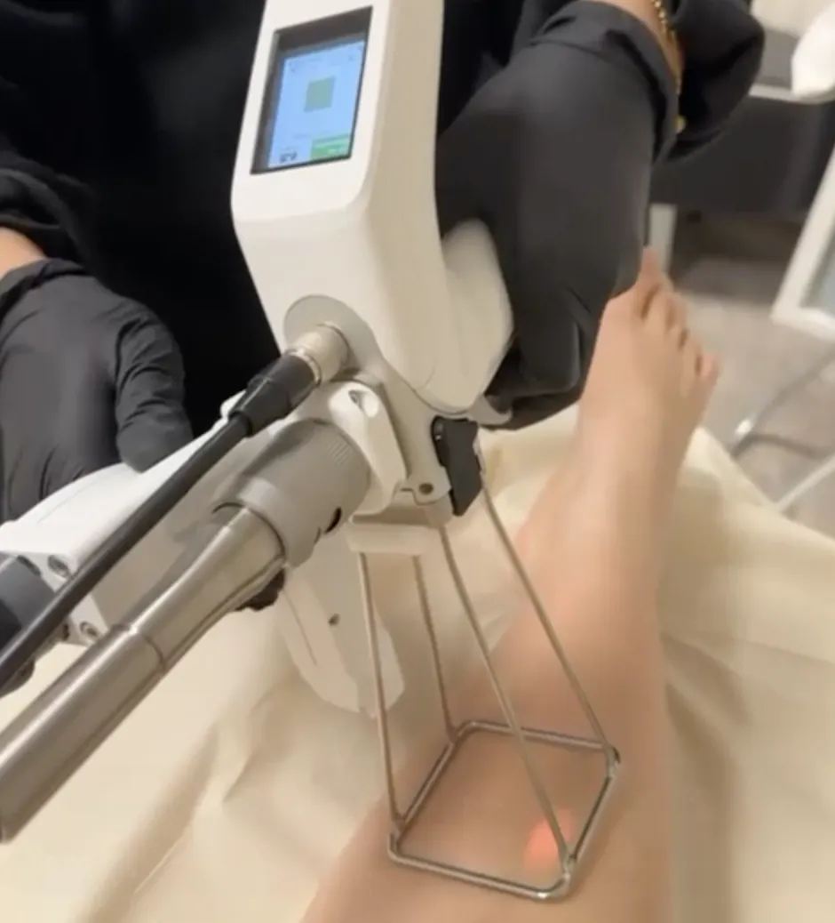 Ultraljudsgel appliceras, vilket medför optimal överföring från apparaten till det behandlade området. Därefter placeras apparaten på huden och dess styrka justeras utifrån hudtyp och område.